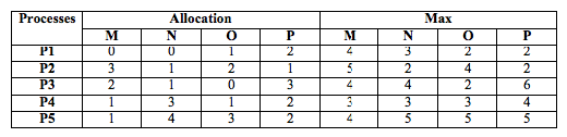 Consider the below given snapshot of the system. P1 to P5 represent the 5 processes currently running on the system. M, N, O and P represent the resources whereas M, N, O and P have 13, 11, 9 and 16 instances respectively.