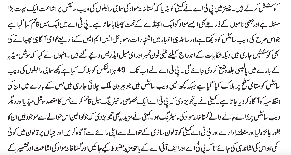 (Islamabad: 26th July, 2019) With reference to recent media reports regarding Chairman PTA’s comments on blasphemous content on social media, it is clarified that Chairman PTA’s comments in today’s senate standing committee meeting are being misquoted and taken out of context. Social media websites are being approached to remove blasphemous content. Regarding blocking of social media websites, it was only used as an example to refer to the blocking of YouTube in 2012 which was executed, in light of the honorable Supreme Court of Pakistan’s directions, against blasphemous caricatures on the social media platform. Hence the reports of PTA recommending blocking of social media websites are entirely false.
