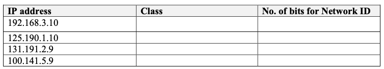 For each of the following IP addresses, identify the class of IP address and No. of bits for Network ID.