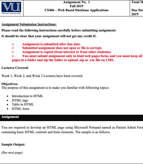 o You must submit assignment only in html web pages form, and you must keep all your web pages in a folder and zip the folder to upload .zip or .rar file on LMS.Lectures Covered: