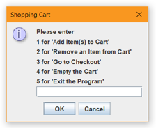 User can remove any item from the shopping cart by using this option; JOptionPane.showInputDialog should be used here. However, if shopping cart is already empty then message “Cart is empty” via JOptionPane.showMessageDialog should be displayed.