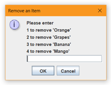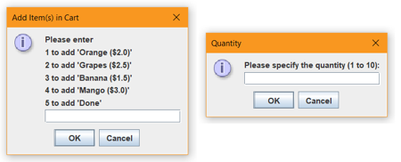 Each time, user selects this option, s/he will be prompted via two Input Dialogs (i.e. JOptionPane.showInputDialog) for selecting an item from available items list (sample data is given below) and its quantity respectively. If inputs are correct (i.e. found no empty/null value and quantity is between 1 and 10) then selected item and its quantity will be added in the shopping cart by using ArrayList from java.util.* package.