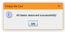User can remove all items from the shopping cart at once by using this option; successful deletion message should be displayed by using JOptionPane.showMessageDialog. However, if shopping cart is already empty then appropriate message like "Cart is empty" should be displayed.