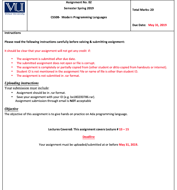 Re: CS508 Assignment 2 Solution and Discussion Assignment No. 02 Semester Spring 2020 CS508- Modern Programming Languages Total Marks: 20 Due Date:12 June 2020 Instructions Please read the following instructions carefully before solving & submitting assignment: It should be clear that your assignment will not get any credit if: • The assignment is submitted after due date. • The submitted assignment does not open or file is corrupt. • The assignment is completely or partially copied from (other student or ditto copied from handouts or internet). • Student ID is not mentioned in the assignment File or name of file is other than student ID. • The assignment is not submitted in .rar format. Submission details Following files must be submitted in a single zip or rar file. • Code file(.adb file) • A .gif file which shows working of your application (For Recording .gif a software named Screentogif is uploaded on LMS, or you can use any other gif recording tool as well) Please note if you submit doc or txt file you will be awarded 0 marks. Make sure to write your own VU ID in the assignment file(s) otherwise assignment will not be accepted. If you do not submit any of the above mentioned file 50% marks per file will be deducted. Objective The objective of this assignment is to give students idea on how to implement object oriented concepts in ADA. Lectures Covered: This assignment covers Lecture # 13 – 17 You will develop Ada console application in GNAT IDE. You can also use any online compiler to compile Ada. Problem Statement: As you know that we cannot implement inheritance in Ada directly as there is no concept of class in Ada, we need to use a mix of tagged types and packages. You are required to create a tagged type as person and then another as men, the tagged type men will inherit from person type. The person type has following attributes: • Name: String • Age: Integer • Gender: Boolean Functions: And also a function named print() [This function will print all three attributes of type person] The tagged type men have following attributes • Height: float • ID: String Functions: This type will also have one function named print() which must print all the attributes of type men and person as well. When application starts an instance of type men will be created and detail of men will be taken from user input and assigned to men type object after that the added details will be printed on the console screen.